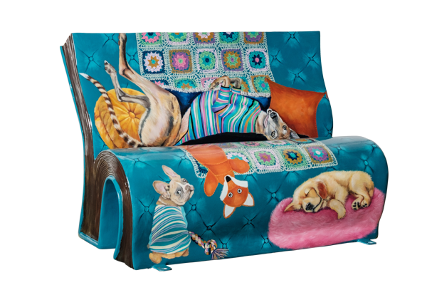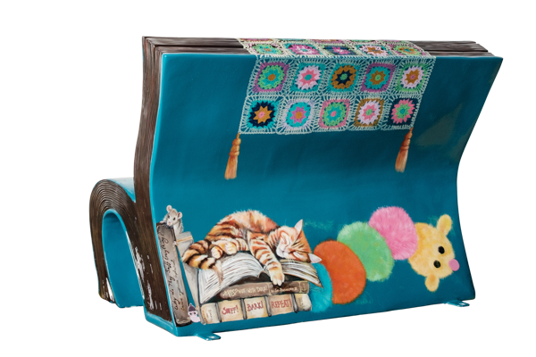 This design shows my Greyhound Miso, who can take over any sofa including a book bench! He is joined by his friends and favourite toys. Greyhounds are lazy dogs known as 40mph couch potatoes, and sleep in a variety of funny positions. Visitors to the book bench will enjoy trying to squeeze into the space he isn’t occupying, much like I have to at home!