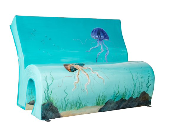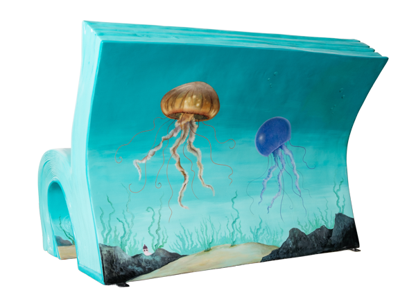 This design features a number of jellyfish adrift in the ocean, washed along yet still bolstered. For some people, the most difficult chapter in life involves dealing with cancer. This particular book chapter shows the sea supporting the jellyfish as they drift, holding them up and carrying them forward. This sculpture is part of The Tall Ships Short Story Trail – a collection of 12 specially-commissioned BookBench works, as part of the artistic celebration of the Tall Ships Races Aberdeen 2025.