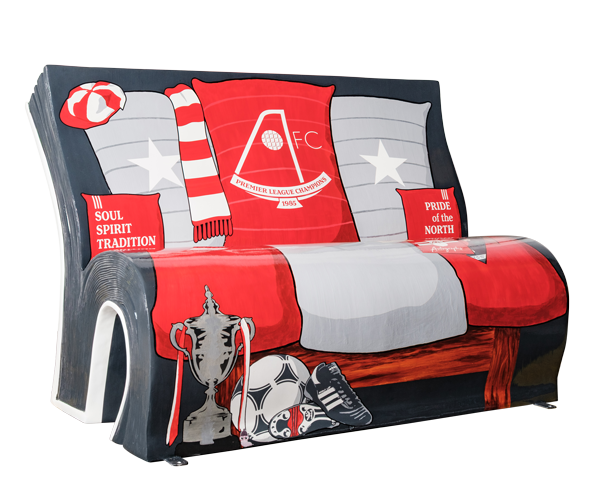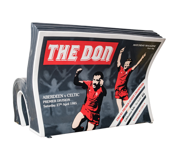 This unique BookBench commemorates Aberdeen FC’s 40th anniversary of winning the Scottish Premier League Championship in the 1984/85 season. The back of the bench features a vintage matchday programme cover, showcasing legendary captain Willie Miller celebrating his goal against Celtic at Pittodrie, which secured the league championship on 27th April 1985. As you look ‘inside’ the bookbench, it reveals a comfy red and white sofa, adorned with some 80s memorabilia.