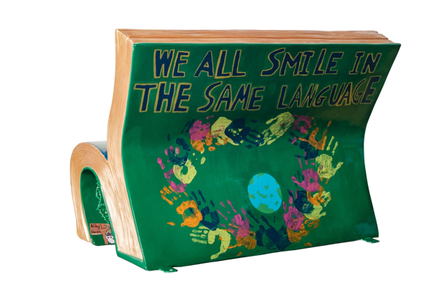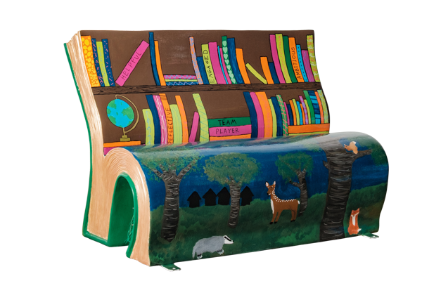 Beneath the canopy of Imagination is designed by the P5 and P6 class of Milltimber Primary School, representing both the school and the local community. The school values are incorporated into the spines of the books on the bookshelf, symbolizing imagination, creativity, knowledge, and learning. The BookBench features the four local animals that represent the school houses, shown in a twilight scene with the Northern Lights visible overhead. On the back, the importance of diversity and inclusion within the school, as well as on a global scale, is highlighted.