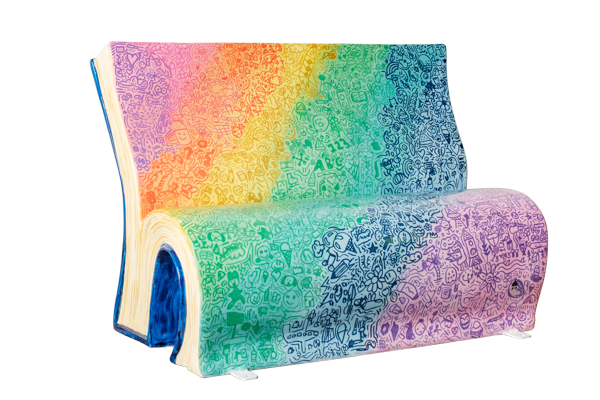 Read, Imagine, Create is designed and painted by the P4-P7 Art Club of Newtonhill Primary School. It is a vibrant celebration of self-expression and storytelling. Inspired by Mr. Doodle, each student created their own designs, combining common themes to bring the final artwork to life. Every section of the bench is filled with doodles representing what is important to the students—their passions, interests, and dreams. As a Silver Award Reading School, they also wanted to highlight the joy of books and the power of imagination. The BookBench tells the story of the students, one doodle at a time!