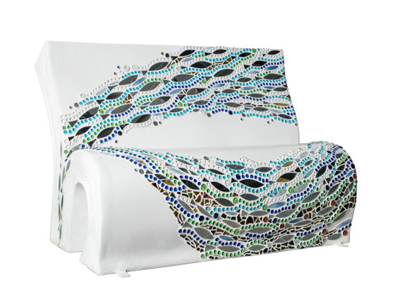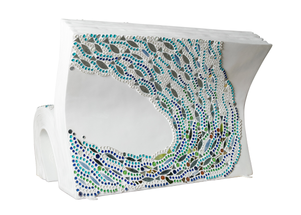 As a teenager Shelagh was captivated by the novel ‘The Silver Darlings’ by Neil M Gunn and tales of the rich fishing heritage of the north and north-east. This mosiac design is inspired by these silver shoals and is made using recycled mirrored and fused glass.
